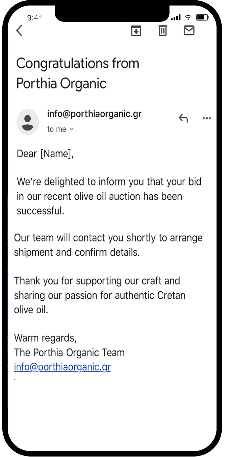Experience a new level of transparency and quality with Porthia Organic Auctions, the official platform connecting distributors and bulk buyers directly to our certified organic olive oil harvests.